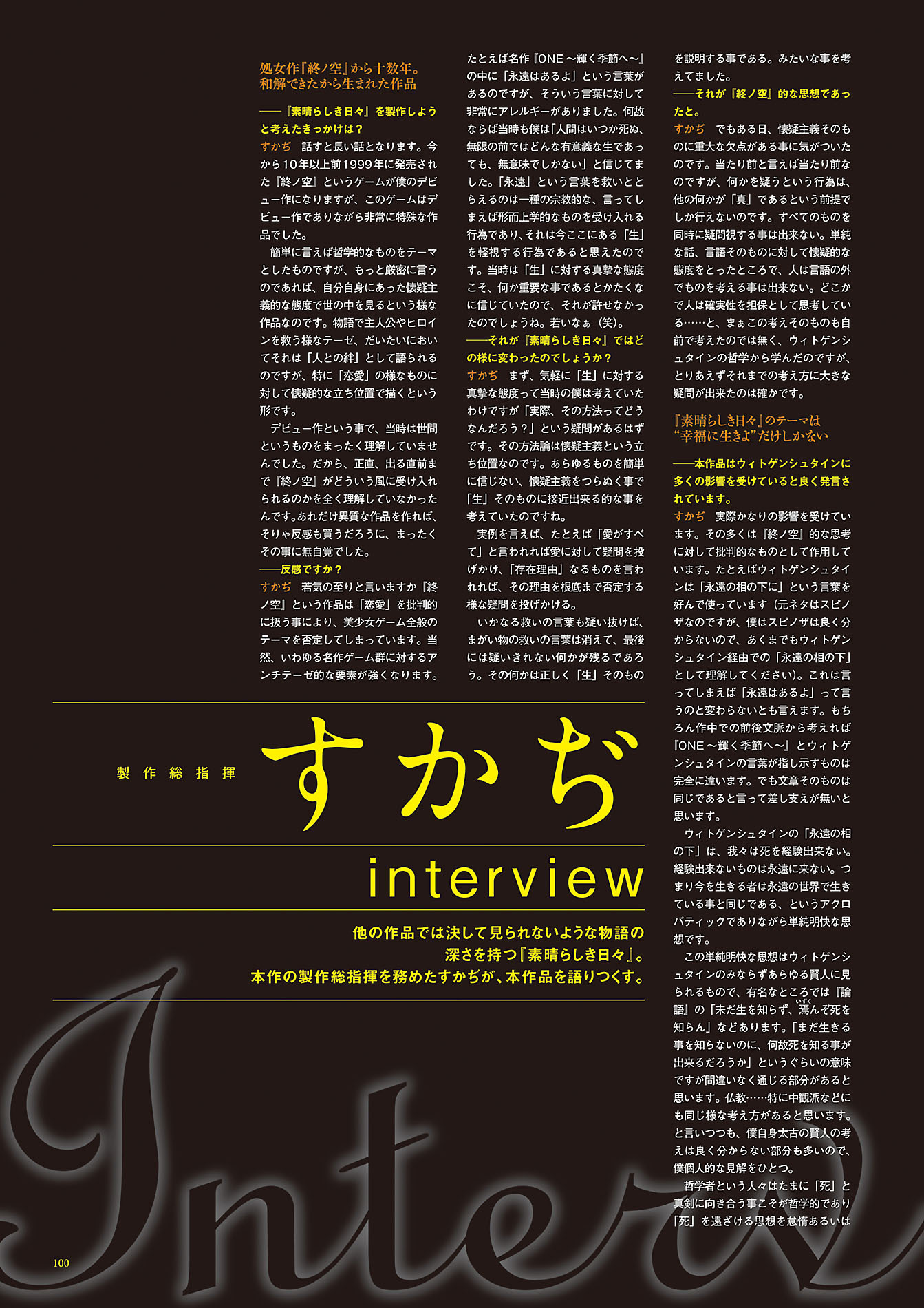 Subarashiki Hibi ~Furenzoku Sonzai~ Official Visual Archive (素晴らしき日々~不連続存在~公式ビジュアルアーカイヴ) is a gorgeous artbook in my opinion, with several pieces made specifically for the book itself, but what intrigues me the most are the "SCA-Ji's Notes" (すかぢ's NOTE) strewn throughout the printing of the CGs, chock-full of commentary and witticisms from the man at the time of production on characters and events in the story, along with a big interview at the end where he discusses the creative process and motives behind the VN as a whole. These make me giddy, I have to admit.